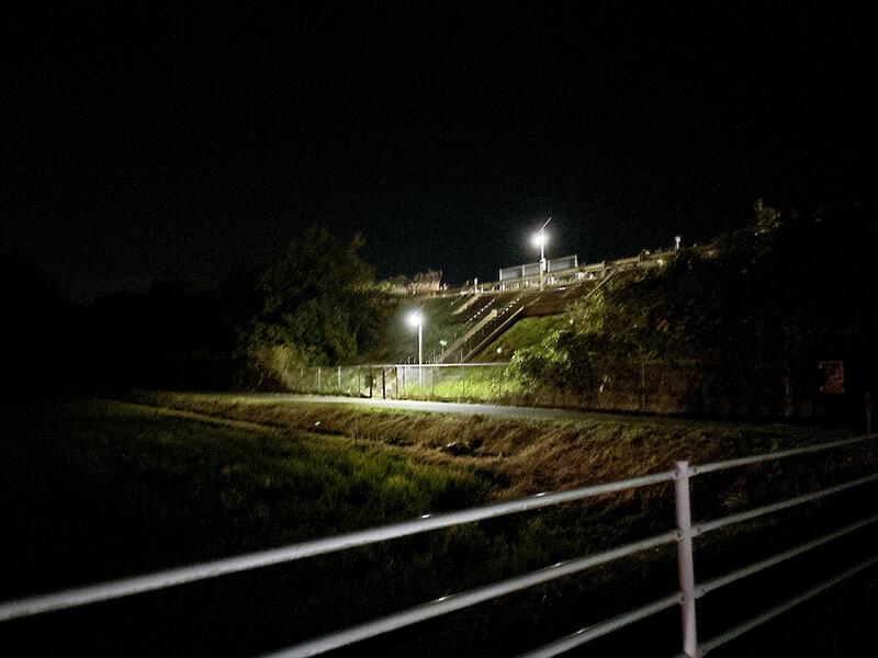 一次避難の訓練を終えた後は、三陸沿岸道路までの津波襲来時の二次避難経路を実際に歩き、目指す二次避難場所の位置などを確認しました。暗い中での移動となりましたが、生徒たちは懐中電灯で足元を照らし、安全に配慮しながら進みました。下の写真は二次避難場所の夜の様子です。